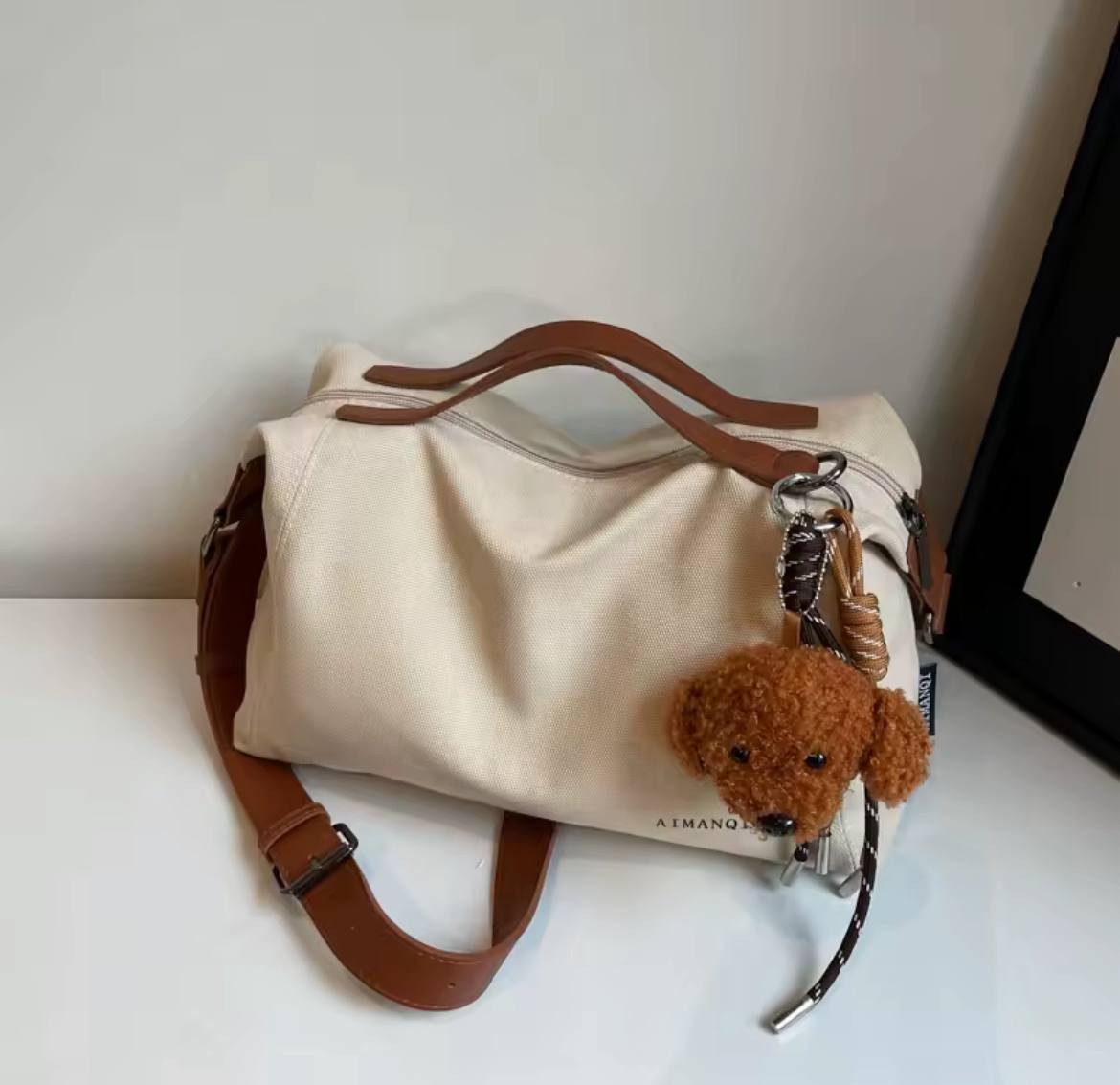 Сумка декорирована брелком.